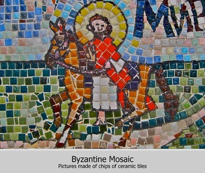 After the fall of the Roman Empire Gothic Art prevailed in the West and Byzantine Art prevailed in the East. Mosaics were the signature product of Byzantine Art. They were religious pictures made from ceramic chips. We could think of them as religious art of crackpots.