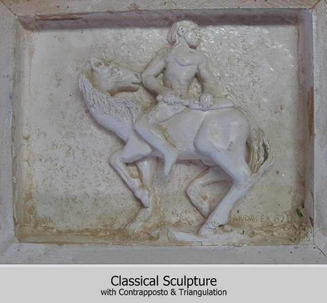 Classical Art of ancient Greece and Rome is best represented by sculpture with contrapposto and triangulation. Triangulation is the re-attachment of legs and arms at distal ends to reinforce the structure and to create negative spaces. These voids tend to be triangular. Contrapposto places more weight on one foot than on the other to produce tension in the composition and twisting so that the “front” is viewed from all sides.