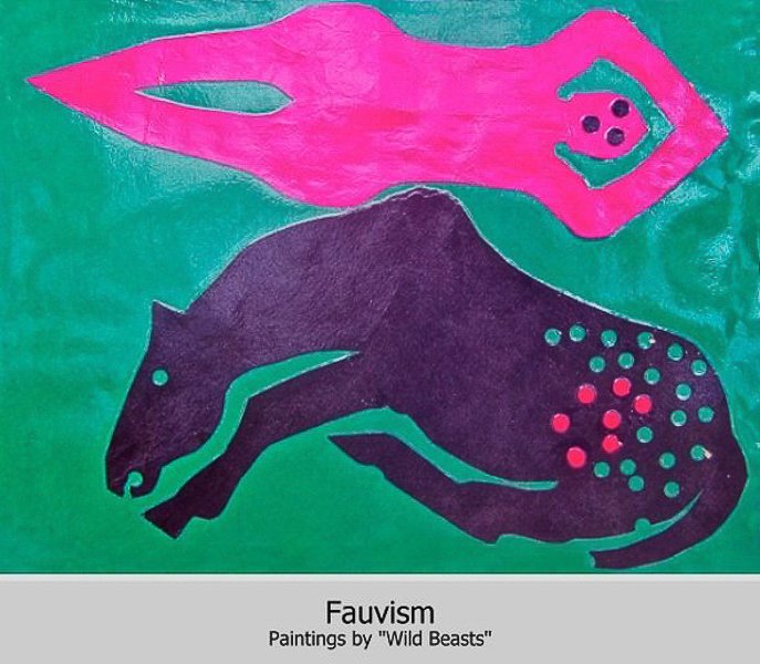 Emboldened by departures from traditional art, some artists used very wild colors and shapes. When they exhibited their pictures in a gallery the art experts said that the pictures looked like they were painted by wild beasts = Fauves.