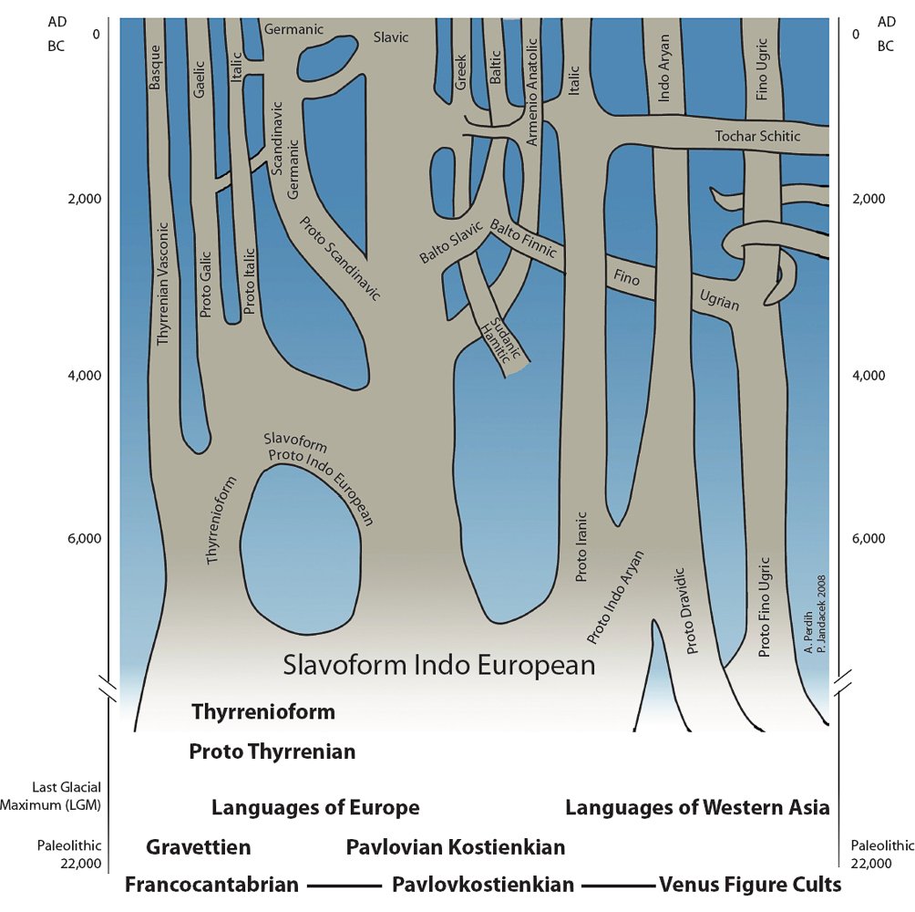 “Indo-Germanic” is as misleading as there would be in the animal kingdom the expression “Trilobito-Avian” (of trilobites & birds). - We posit that the Slavic Languages as the organic trunk of the Indo-European Language Tree yield better terminology for the language branches. These branches would be Slav-Indoiranic, Slav-Armenanatolic, Slav-Tocharscythic, Slav-Suevandalgothic, SlavKeltitalic and Slav-Helilyric. Thus, for sake of a more accurate understanding of the phenomenon we must create a new lexicon. Based on the 19th Century word choice of “Indo-Germanic” it would seem legitimate to apply a more accurate designation such as “Indo-Slavic”. Similarly, to the west (based on the contributions of Ringe et al. [8]) we are justified in using terminology such as “Germano-Slavic”. Preliminary evidence had suggested to a few linguists that Tocharian A and B are somewhat linked to Italic (KeltItalic). But based on geography, proximity, and the possible migration routes we are forced to accept Slavic as the missing link between western Europe and Chinese Turkistan.