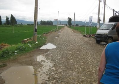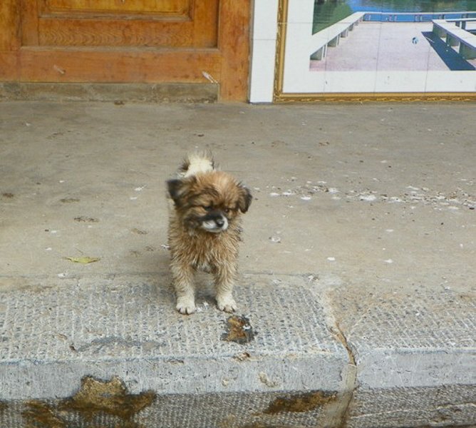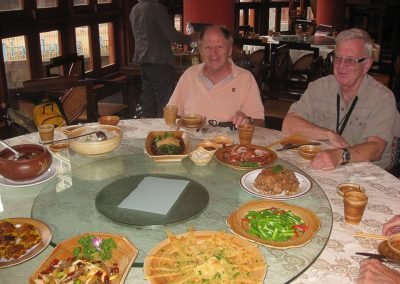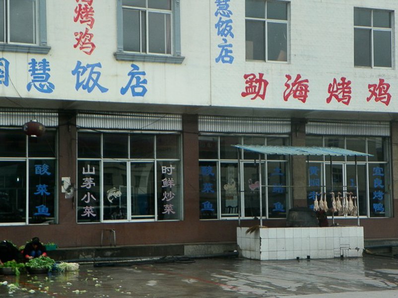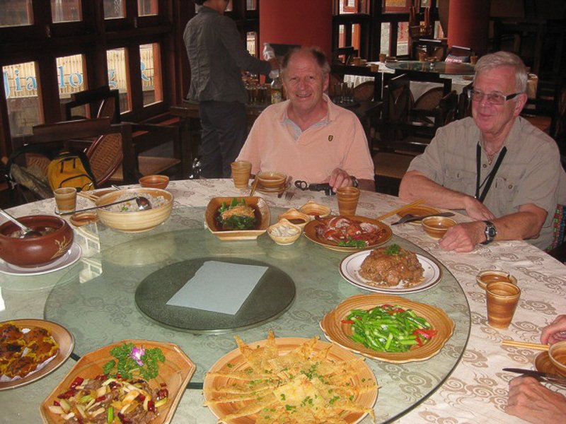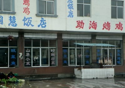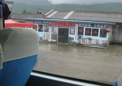Our bus stopped at these check stations. Our passports were checked not only at hotels but every time we crossed into a different district. This was a check station where our guide had to inform the authorities that her tour group was traveling north, our itinerary, and how long we’d be in that region. The next town up the road is Shangra-La. The Communist system kept really close tabs on everyone, locals and tourist alike. Stopped to have lunch along the way, my favorite was the duck. And the pit toilets had the privacy of a door! There was a dog under the table where we ate on the patio (it had stopped raining at that point). Pete and I both fed the little guy.