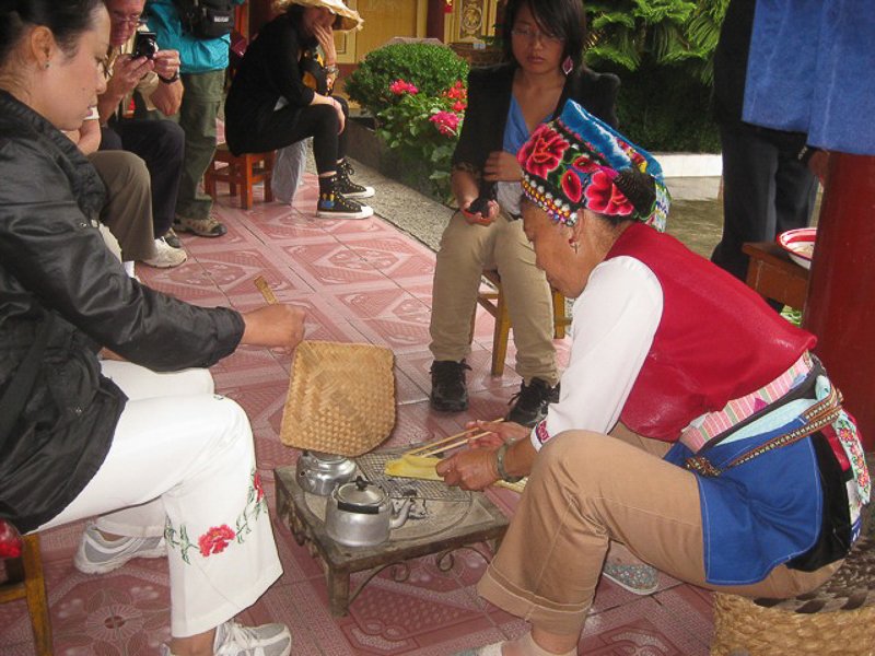 The bus took us to the home of an ethnic minority Bai family, consisting of grandparents, son, daughter in law, and a little girl about 5. The grandparents were our hosts for lunch. Welcomed into their kitchen we saw the area used to clean vegetables, about the size of a large sunken bathtub! You sit on the edges. Sorry I don’t have a photo. There is a brick used to cover the drain when not in use to prevent rats from using it as an entrance to the house.