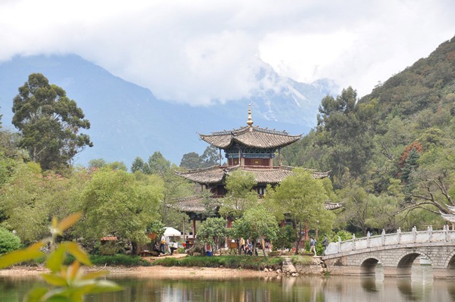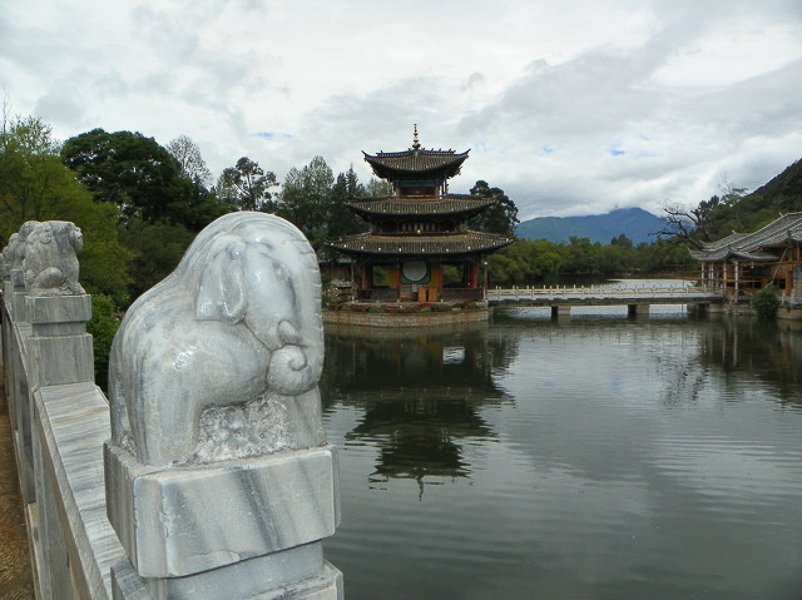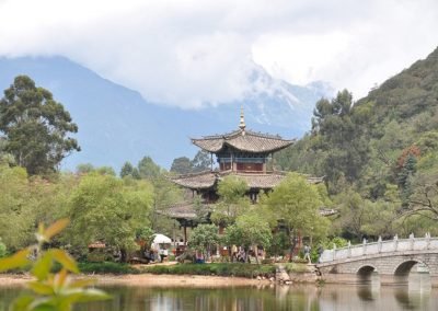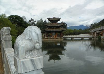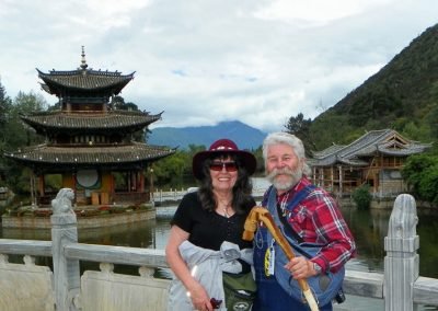We walked around the Black Dragon Pool. It’s an absolutely stunning park. We passed many pagodas, bridges….including the “lost lover bridge”. Most of the parks here have exercise equipment. Just as US parks might have picnic tables or playgrounds for children, here the adults (including seniors) are using exercise equipment. I’ve only seen one overweight man in Yunnan and no overweight women or children. Everyone walks a lot and the diet seems to be 95% rice, tofu and vegetables. The clouds eventually lifted from the 18,300′ peak of Jade Dragon Snow Mountain. No rain this day! The first rainless day since we arrived.