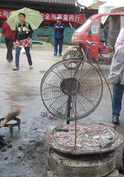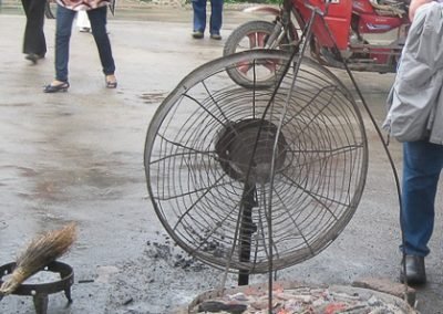 This is the oven, consisting of a bottom round unit filled with charcoal. The pizzas sit on top of this unit. The top unit of hot coals is on a swinging handle, it slides to the side as the pizzas are put on top of the lower unit, then it slides back on top, giving the pizzas an “oven” heat from both top and bottom. The fan provides enough wind to keep the coals glowing at the desired temperature. It took about 15 minutes, and with some additional lard the pizzas were browned and ready to sell.