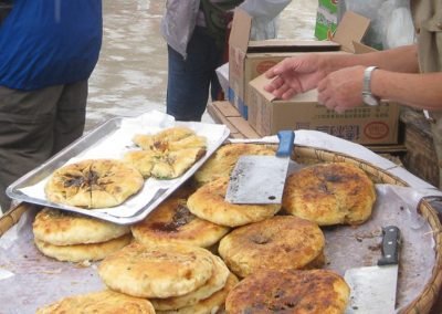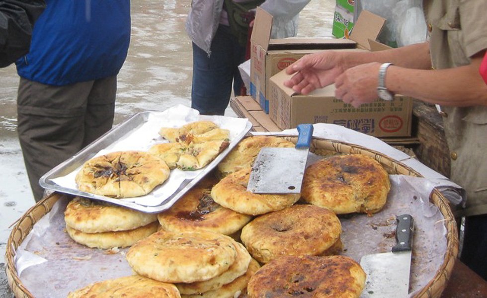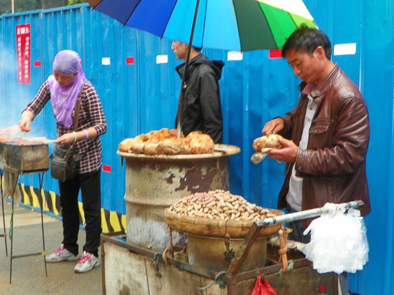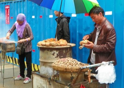 We had several cooking lessons on the trip, aside from watching this woman make Chinese pizzas in the rain at a street stand we also got to roll out the dough and make them ourselves. It was raining on and off but the stand was under an umbrella. It was a family business where the woman actually made the pizzas while her husband baked them and sold the finished products.