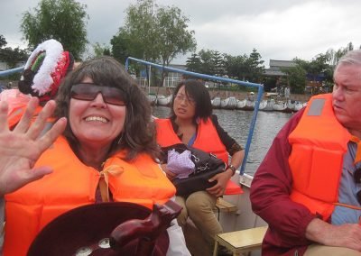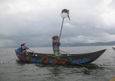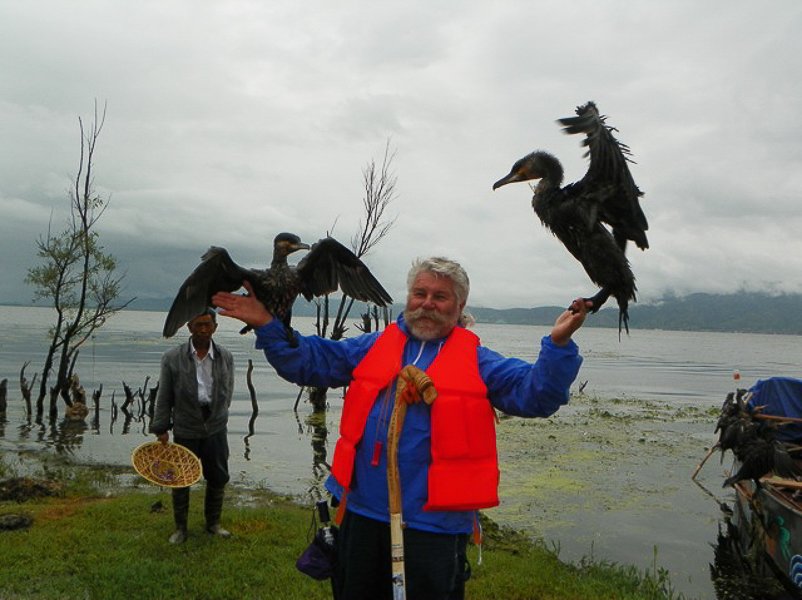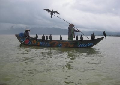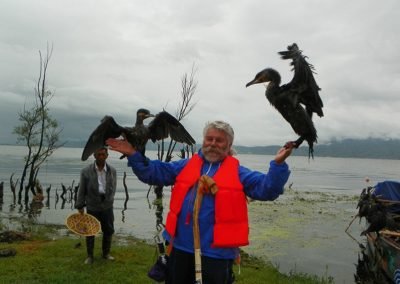 We boarded an open boat, approximately 18′ long. We sat on tiny footstool benches, suitable for the butts and short legs of 2nd graders. Very low, only 1′ off the floor. The woman rowing all of us weighed 100 lbs, strong as hell, buck teeth and looked about 50! God bless her, what a hard way to earn a living. She rowed us out onto the lake about 1/2 hour, stopping near the cormorant fishing boat.