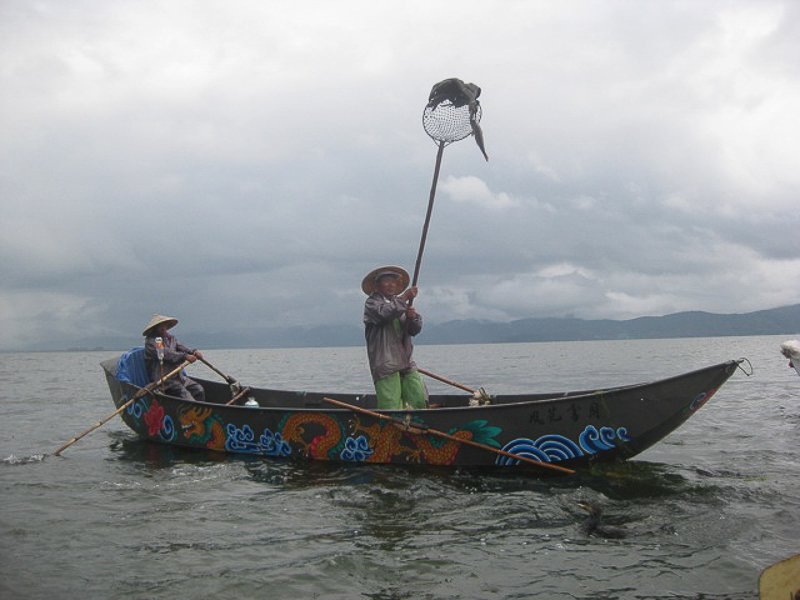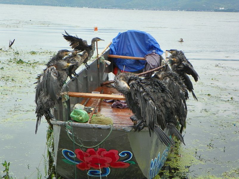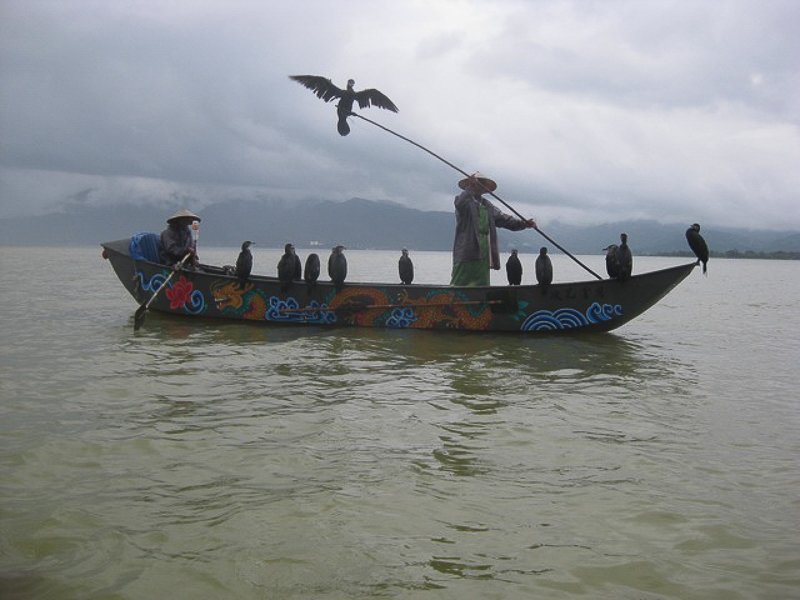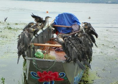 Two fishermen had about a dozen cormorants. At first the man took bird #1 and put him on a long pole to check out the water below. I assume the cormorant was trying to spot fish. After a while this first bird dives and the fishermen push all the birds into the water. Due to the neck rings the birds can only swallow small fish. Larger ones are brought back to the boat.