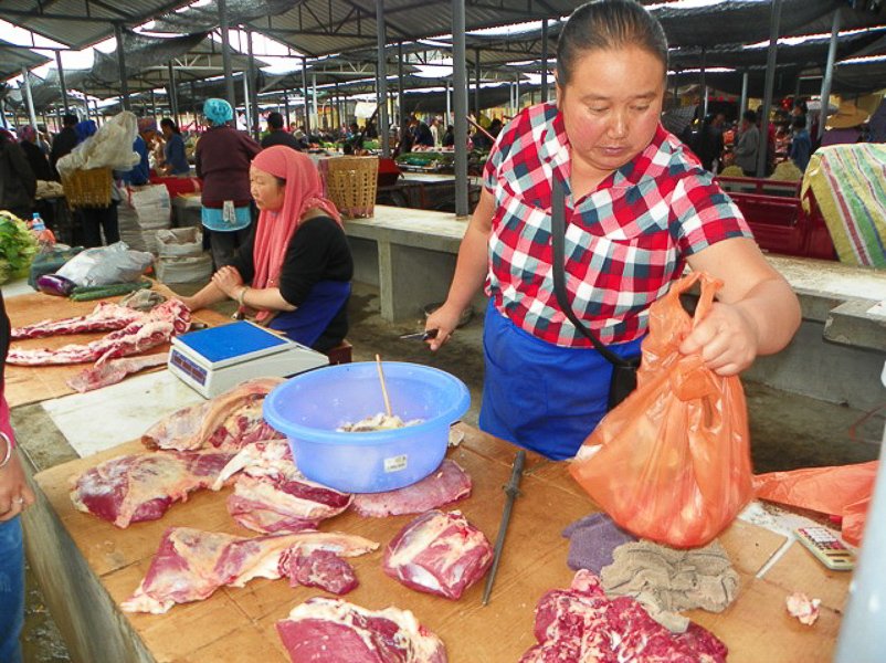 One of the tourist attractions is horseback riding, These tough little ponies are rented out to tourists, mostly Chinese. In fact I didn’t see any Anglos on the horses. We had dinner at a noodle place on the plaza. A tray of vegetables arrived first, then a bowl of rice noodles, and finally a large pot of very hot, nearly boiling broth. The waiter picked up the veggie tray and noodles and dumped them into the soup. It was really very good. We also ordered spicy BBQ yak on skewers. I thought it was good, even with the yak being a bit tough and fatty.