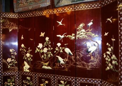 This is my personal favorite, the panel screens of cranes in jade on dark wood. Cost $5000.