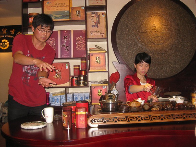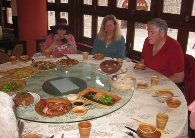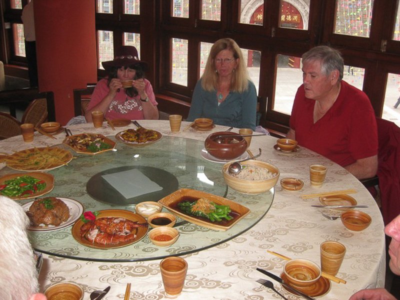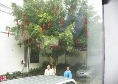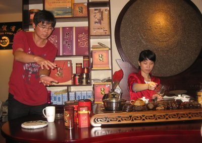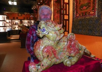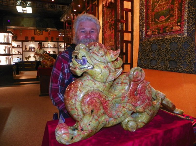Our guide, Alvin, was translating everything the woman giving the tea demonstration had to say. We were offered multiple types for sampling. I asked Alvin if when he had friends over, did he serve them tea? He said no, he’d offer beer and coke, whereas his parent’s generation would certainly offer tea. Times and customs are changing. We were offered tea with and without caffeine, green tea, rose hip tea, etc. It was interesting to put so much emphasis on tea ceremony including pouring the first cup from each pot onto the tea “pets”, clay figurines of little animals. No milk, no lemon, no sugar, no honey, just tiny cups of tea, constantly being refilled. Some had a nice aroma. We were given instructions on how to hold the cup, how to sniff and then to chew before swallowing. It is also correct to slurp it.