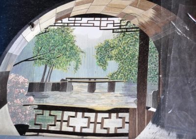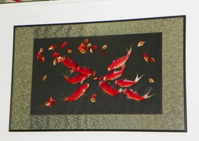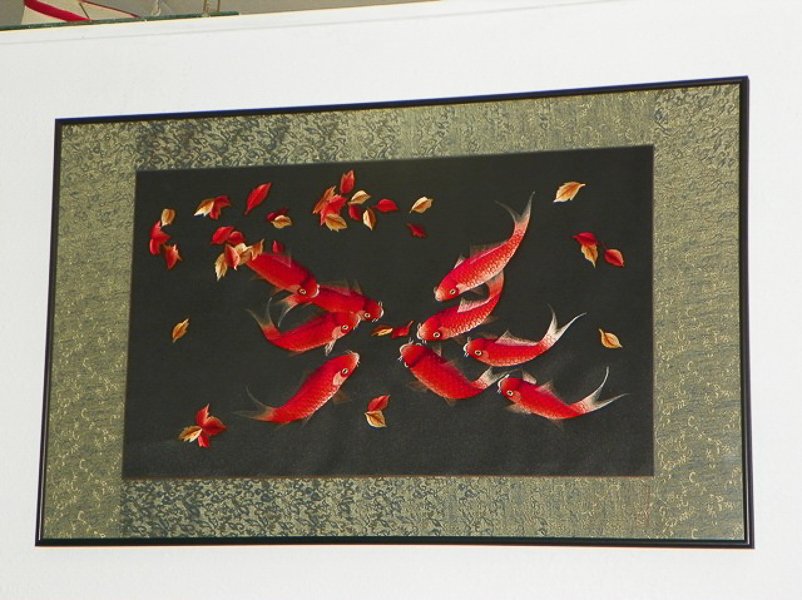 After leaving the work area we went into the sale gallery. Fell in love with and bought this one of goldfish. The number 9 is significant, meaning “forever”. The swimming tells of “freedom” and the goldfish represents “prosperity”. The picture was taken out of the simple black metal frame and rolled/inserted in a tube. When we returned home we had it reframed. I celebrated my birthday in China, Pete bought me such an outstanding gift.