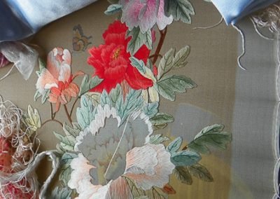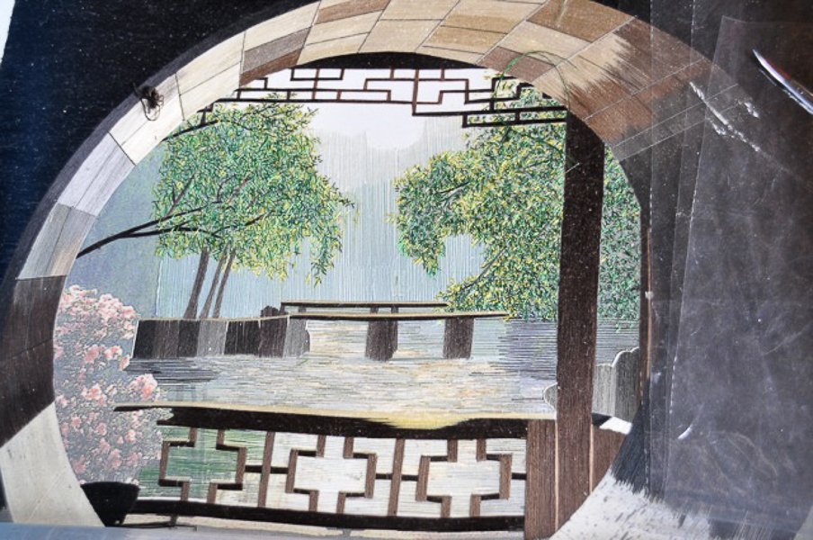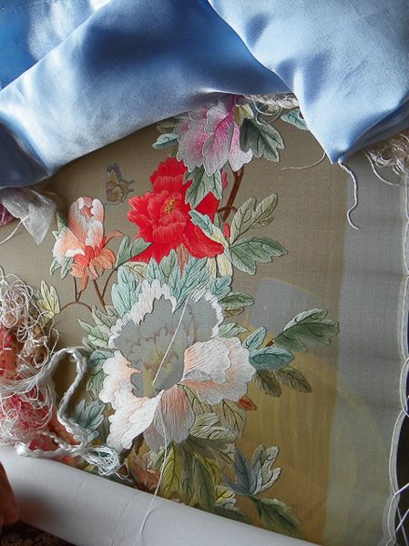 The thread is silk. At the shop we visited there was a master teacher and about 10 of her students working on embroidery looms/wooden frames/on silk cloth. There are no knots, just the thread doubled back on itself. The back is perfectly smooth.Whereas traditional commercial embroidery thread in the US divides into 6 strands, the silk divides into over 100. It amazed me that the women’s eyes could see the fine detail hour after hour and day after day.
