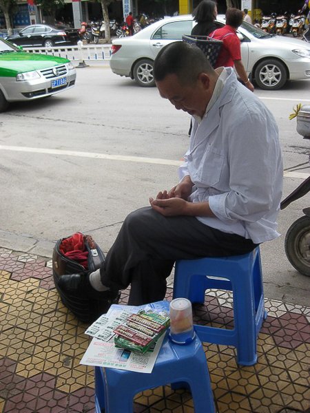 This fellow was a “street dentist” selling teeth. Look at the bench in front of him and you’ll see little teeth lined up on the cardboard sheets. Our guide said he didn’t have a license to be a real dentist, so he takes a chance of arrest by setting up shop on the sidewalk. I have no idea how someone would attach the loose teeth he has for sale.